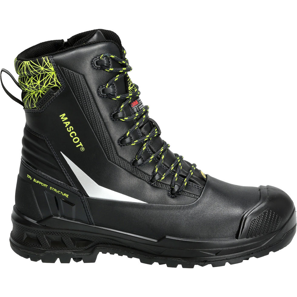 Cierre con cordón. Puntera de compuesto. Entresuela de material textil MASCOLAYER®. Cambrillón multifunción de estabilización con amortiguación absorbente integrada. Entresuela de PU. Suela de goma con insertos de goma antideslizante. Plantillas extraíbles, antiestáticas y resistentes. La plantilla son absorbe impactos. Absorbe y elimina la humedad. La suela es resistente a aceite y petróleo. Suela resistente a calor por contacto de hasta 300 °C. Sujeción de escalera. Aislante Thinsulate™. Membrana resistente al agua de tejido MASCOTEX®. Material exterior hidrófugo y transpirable. Aptos para trabajar de rodillas. Refuerzo de talón de TPU. Una pisada estable en cualquier superficie con la suela antidesgaste, antideslizante y autolimpiable de la bota. Suela que no deja huella: sin marcas de rozaduras.