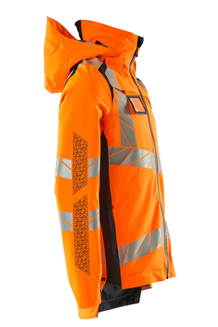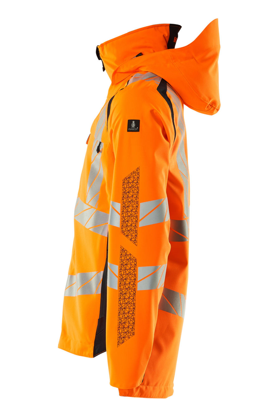 Fluorescente y con bandas reflectantes cruzadas en chevrón y verticales. Dos tonos. Muy transpirables y resistentes al viento y al agua. Costuras estancas. Capucha con forro separable con cordón ajustable. Cable ajustable en ambos laterales de la capucha. Cierre con cremallera resistente al agua y solapa de protección interna. Bolsillo interior, dos con cremalleras y uno de malla abierto. Portatarjeta de identificación separable. Bolsillo en el pecho con cremallera resistente al agua. Bolsillos delanteros con cremalleras resistentes al agua. Cuello alto. Acanalado interior en el borde inferior en la parte frontal de la chaqueta. La solapa en la espalda de la chaqueta se puede doblar para obtener una longitud de espalda estándar o soltar para una espalda ampliada. Acanalado (oculto en solapa de protección) en puños. Puños elásticos. Con efectos de impresión.