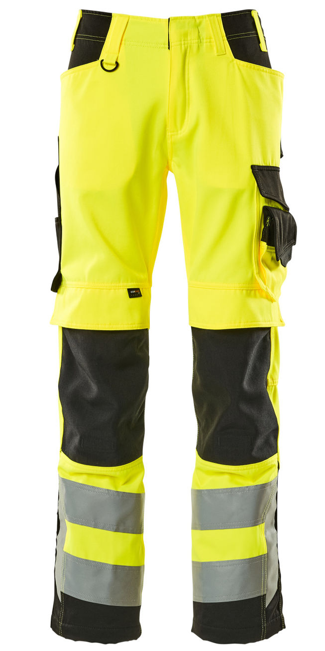 Fluorescente y con cintas reflectantes. Dos tonos. El Teflon® otorga al producto resistencia a la suciedad. Costuras triples en pierna y entrepierna. Cintura baja y pretina con corte de forma. Pierna de pantalón con forma ergonómica. Trabillas. Bragueta con cremallera. Anilla en D. Bolsillos delanteros. Bolsillos traseros con refuerzo, solapa y botones de presión ocultos. Asa de martillo ajustable. Bolsillo de muslo reforzado con bolsillos adicionales Bolsillo para metro con abertura reforzada de CORDURA®. Bolsillos para rodilleras ajustables con tejido CORDURA® (500 D) resistente con solapa y acceso superior. Reflejos verticales en el lateral de las piernas para mayor seguridad. Cada longitud de pierna estándar se puede alargar 3 cm si se liberan las puntadas rojas internas.