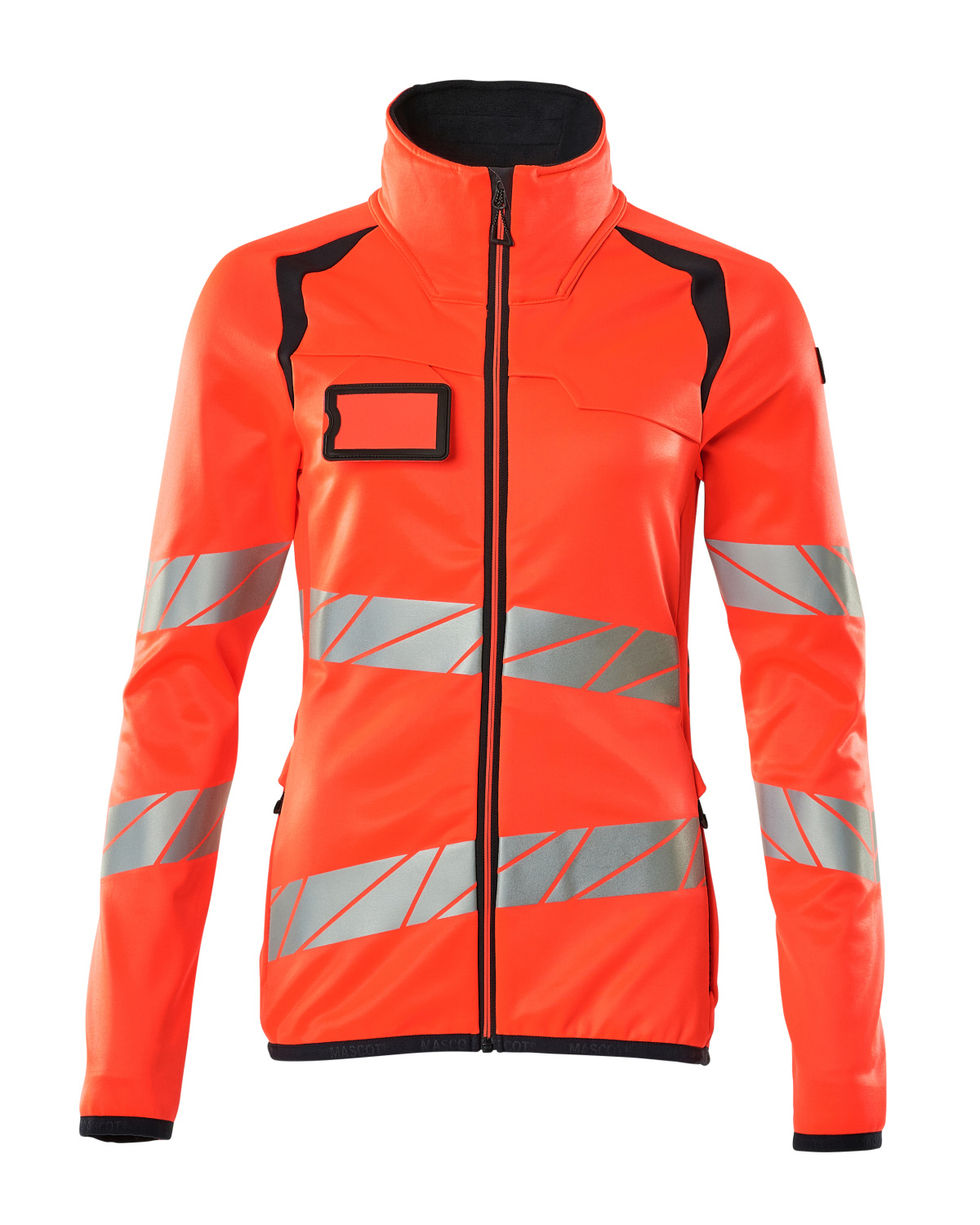Estilo de señora. Fluorescente y con bandas reflectantes cruzadas en chevrón. Estilo ceñido y moderno con gran libertad de movimiento. Cuello alto. Dos tonos. Cierre con cremallera y solapa de protección interna. Bolsillos delanteros con cremallera. Bolsillos interiores. Puños y cintura elásticos. Portatarjeta de identificación separable.